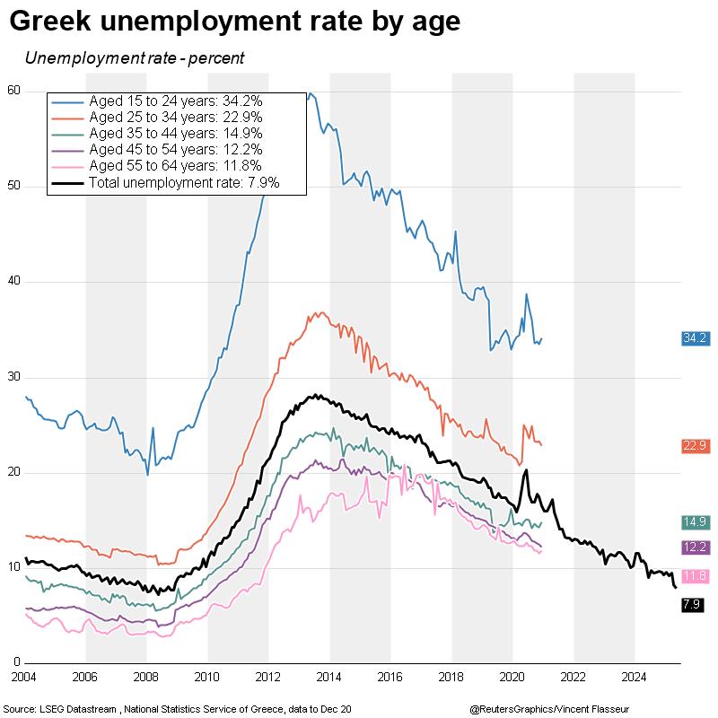 Γράφημα με την ανεργία στην Ελλάδα από το 2004 και μετά ανά ηλικία.