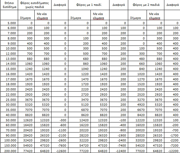 Με την αλλαγή που έχει αποφασίσει το υπουργείο Οικονομικών οι επιβαρύνσεις ξεκινούν από τα 6.000 ευρώ για τους φορολογούμενους με παιδιά και φτάνουν για όλους τους φορολογούμενους μέχρι και το εισόδημα των 50.000 ευρώ. Με την προηγούμενη εκδοχή της φορολογικής κλίμακας όπου ο συντελεστής 35% ξεκινούσε από τις 16.000 ευρώ οι επιβαρύνσεις έφταναν μέχρι και το ετήσιο εισόδημα 90.000 ευρώ. Με άλλα λόγια η νέα εκδοχή της φορολογικής κλίμακας είναι πιο "φιλική" για τους φορολογούμενους με εισόδημα από 50.000 - 90.000 ευρώ. Ωστόσο, ακόμη και τα μεγαλύτερα εισοδήματα που με τη νέα φορολογική κλίμακα ελαφρύνονται θα πληγούν από την σαρωτική κατάργηση των φοροαπαλλαγών.