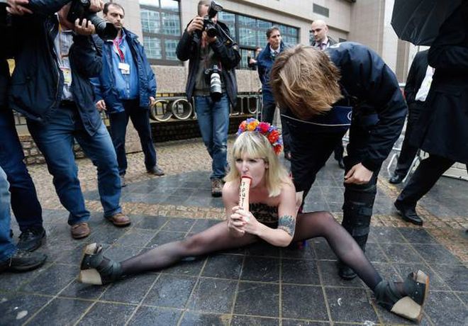 Σε μια ακόμη πρωτότυπη αλλά και...πικάντικη διαμαρτυρία προχώρησαν οι γυμνόστηθες ακτιβίστριες της οργάνωσης FEMEN έξω από το κτίριο του Ευρωπαϊκού Συμβουλίου.