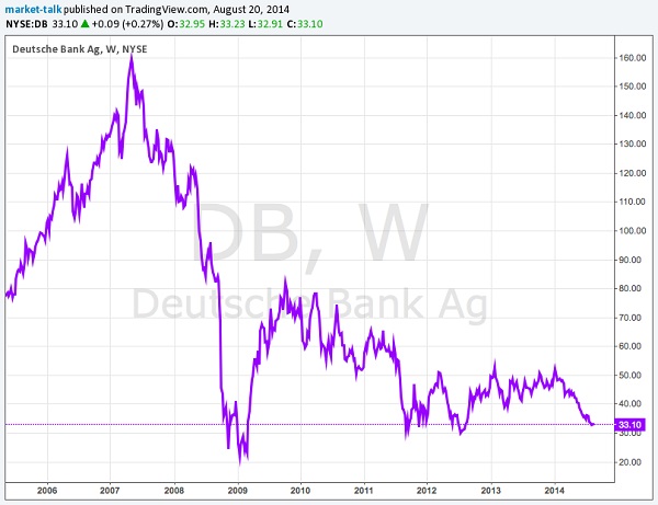 Το πιο πάνω διάγραμμα είναι της αγαπημένης μου ευρωπαϊκής μετοχής, της Deutsche Bank, την οποία μου αρέσει να κριτικάρω. Εδώ και αρκετά χρόνια ορισμένοι φίλοι με ρωτούν που βλέπω το χαρτί μακροχρόνια και η απάντηση μου συνεχώς είναι ότι την βλέπω στο μηδέν.