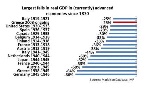 Συγκεκριμένα, όπως σημειώνεται στη σχετική λίστα που έχει διαμορφωθεί από τα στοιχεία του ΔΝΤ και της βάσης δεδομένων Maddison, η Ελλάδα έχει βιώσει ακόμη μία μείωση του ΑΕΠ της κατά 25% από το 2008 μέχρι και σήμερα, από την έναρξη δηλαδή της παγκόσμιας χρηματοοικονομικής κρίσης και μετά κατά τη διάρκεια της μεγάλης ύφεσης, λόγω της ελληνικής κρίσης χρέους.