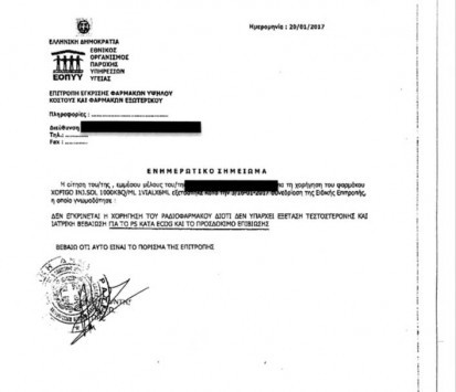 Ο βουλευτής επισυνάπτει και το έγγραφο της Επιτροπής Έγκρισης Φαρμάκων Υψηλού Κόστους και Φαρμάκων Εξωτερικού του ΕΟΠΥΥ με ημερομηνία 20.01.2017 από το οποίο προκύπτει ότι η επιτροπή γνωμοδότησε πως δεν εγκρίνει το φάρμακο επειδή δεν υπήρχε μια συγκεκριμένη εξέταση και δεν υπήρχε και ιατρική βεβαίωση για το προσδόκιμο επιβίωσης.